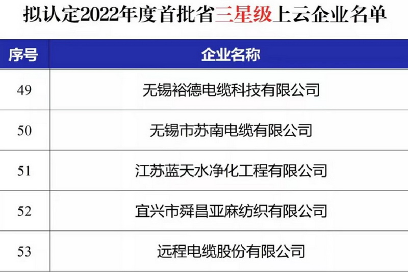 根據(jù)省工業(yè)和信息化廳《關(guān)于組織開展2022年度首批省星級(jí)上云企業(yè)創(chuàng)建工作的通知》(蘇工信融合〔2022〕46號(hào))要求,經(jīng)企業(yè)申報(bào)、各市(縣)區(qū)審核推薦、專家評(píng)審、專題會(huì)審等程序,擬認(rèn)定我司無(wú)錫市蘇南電纜有限公司為省三星級(jí)上云企業(yè),