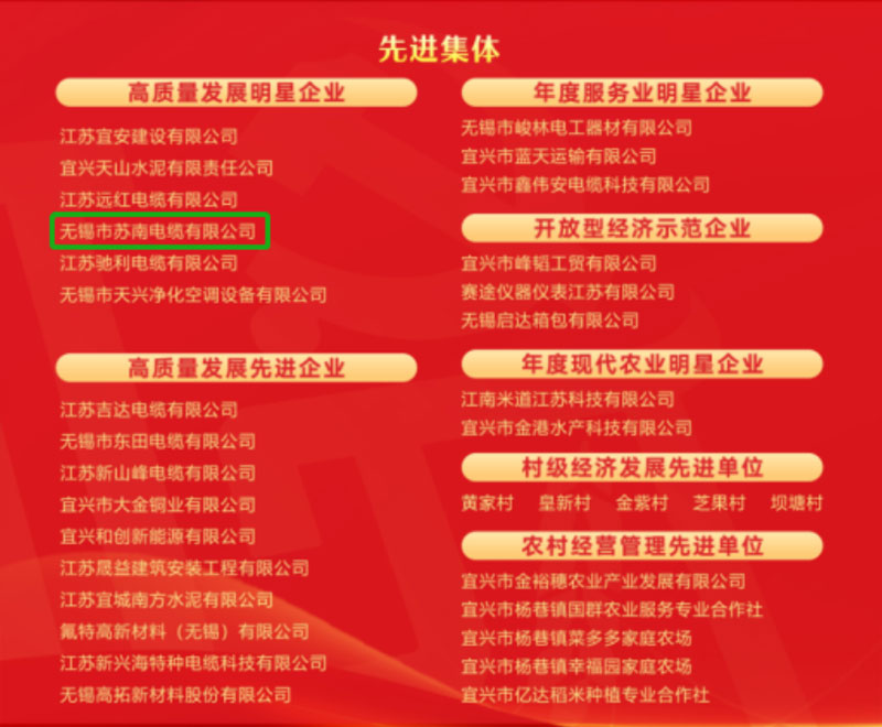 無錫市蘇南電纜有限公司榮獲“高質量發展明星企業”稱號。