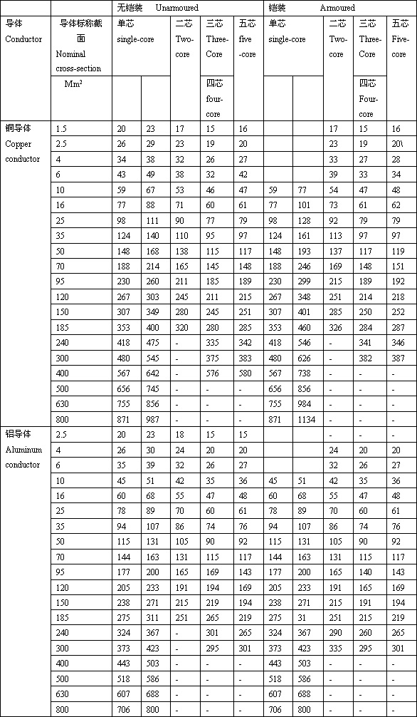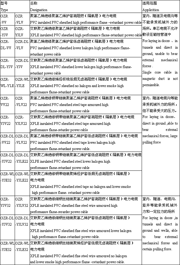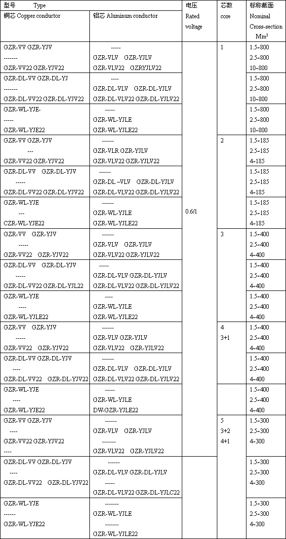 | GZR-YJV GZR-DL(WL)-YJV GZR-YJV 22 GZR-DL(WL)-YJV22 GZR-YJV 32 GZR-DL(WL)-YJV32 | GZR-YJLV GZR-DL(WL)-YJLV GZR-YJLV 22 GZR-DL(WL)-YJLV22 GZR-YJLV 32 GZR-DL(WL)-YJLV32 | 3 | 10~500 10~500 10~500 | 25~500 25~500 25~500 | 25~500 25~500 25~500 | 35~500 35~500 35~500 | 35~500 35~500 35~500 |